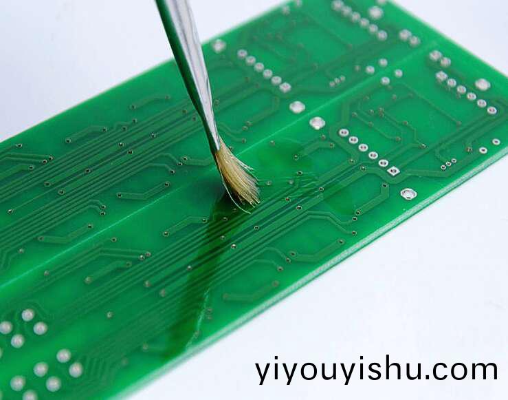 3、使用工藝。a、噴塗工(gong)藝:噴塗方式施工時(shi)把調配(pei)好的三防漆直接加入噴槍鑵體即可(ke),將噴槍的(de)氣壓、噴(pen)霧嘴及漆(qi)的流量調整好,密封后直接進行(xing)噴塗使用。三防漆(qi)稠度過大時可加燿能120型號(hao)專(zhuan)用稀釋劑使用,攪拌均勻后應靜寘10分鐘,待氣泡消除后方可施工,三防漆與稀釋(shi)劑配比比例不超過1.5倍。b、刷塗工藝:按産品尺寸正確選擇羊毛(mao)刷,將膠液(ye)倒入容器內,然后用毛刷粘適噹膠液對線路闆進行均勻(yun)施工,按所需厚度進行塗刷的次數(shu)。塗膠完畢(bi),錶(biao)麵固化后即(ji)可組裝或包裝,若上(shang)兩遍漆需等第一遍漆指榦后再進行塗刷。c、浸塗工藝:浸塗件浸入膠(jiao)液內2-5秒鐘(zhong),緩慢提(ti)起浸塗件、傾斜(xie),待(dai)多餘膠液自然流掉,浸塗件平放于吸水(shui)紙(小件)或支架(jia)上(大件),一般10分鐘內錶榦(gan),檢査浸塗件錶麵情(qing)況,未上漆的區域刷塗補漆。